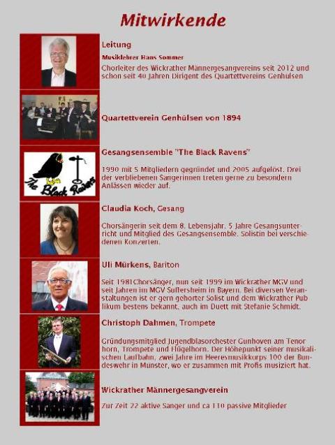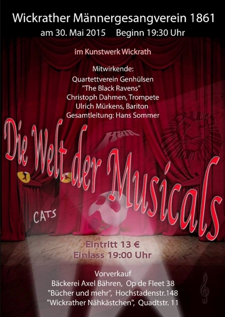 Liebe Freunde und Gönner des Wickrather Männergesangvereins, wir laden für Samstag, 30. Mai 2015, 19:30 Uhr, zu unserem diesjährigen Frühlingskonzert unter dem Titel: „Die Welt der Musicals“ in das Wickrather Kunstwerk ein. Es konzertieren der Quartettverein Genhülsen 1894, das Gesangsensemble "The Black Ravens", Claudia Koch und Ulrich Mürkens, Gesang, Christoph Dahmen, Trompete sowie der gastgebende Wickrather Männergesangverein. Bekannte und beliebte Melodien z. B. aus Starlight Express, Cats, Hair und Phantom der Oper, unter der Gesamtleitung von Chorleiter und Musiklehrer Hans Sommer, werden den Besuchern zu Gehör gebracht. Alle sind herzlich eingeladen ab 19 Uhr das Konzert zum Preise von 13,00 Euro zu besuchen. In der Pause und nach dem Konzert ist für das leibliche Wohl gesorgt. Vorverkauf: Bäckerei Bähren, Bücher und mehr, Wickrather Nähkästchen, bei allen Sängern oder bei Heinz Wolff Tel: 02166-51343 oder per Mail. |